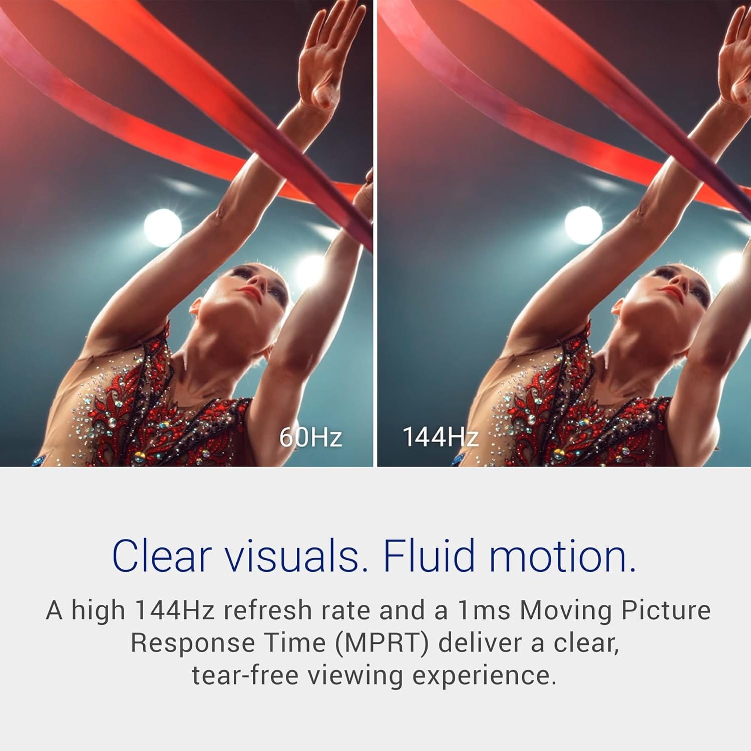 • Clear visuals. Fluid motion: A 144Hz refresh rate and 1ms MPRT deliver smooth, tear‑free motion across work, gaming, and streaming for clearer, more fluid viewing.